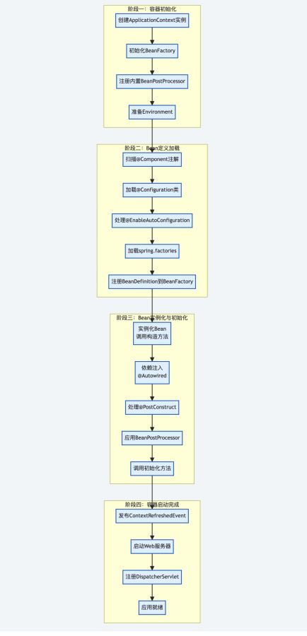 @SpringBootApplication注解开始,经历容器初始化、Bean定义加载、Bean实例化与初始化、容器启动完成四个阶段 - 依赖注入:通过