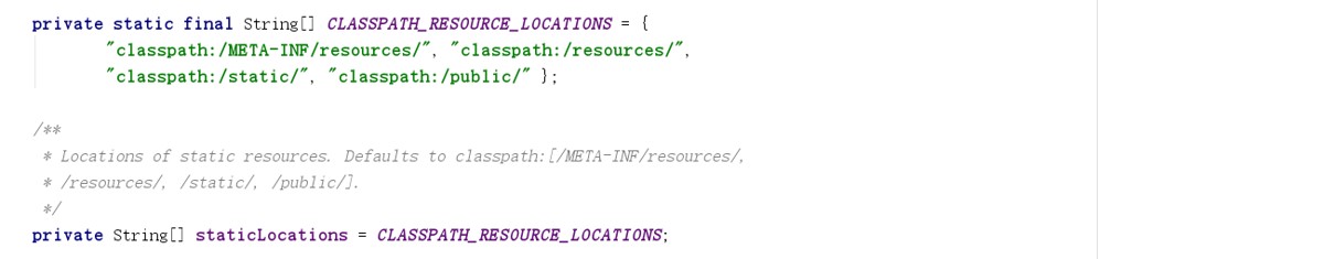 点击 getStaticLocations 函数进入 ResourceProperties 类中,里面 staticLocations 读取默认 / 自定义的静态资源目录,默认值为四个目录