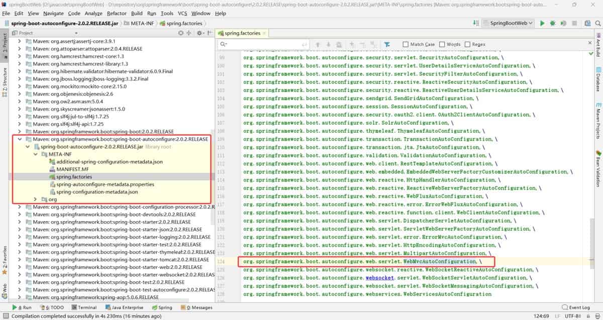 首先我们找到 spring-boot-autoconfigure 的jar包,点击 spring.factories 文件,找到 org.springframework.boot.autoconfigure.web.servlet.WebMvcAutoConfiguration,