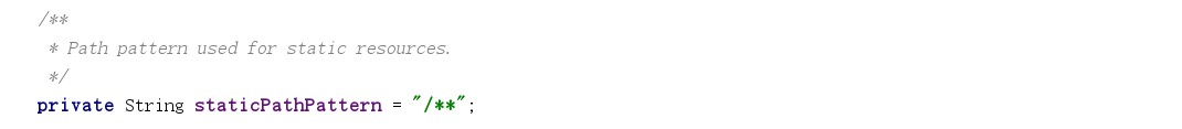 点击 getStaticPathPattern 函数进入 WebMvcProperties 类中,里面 staticPathPattern 注册 URL 访问路径模式,默认是 /**(所有未被 Controller 处理的请求),可通过配置修改