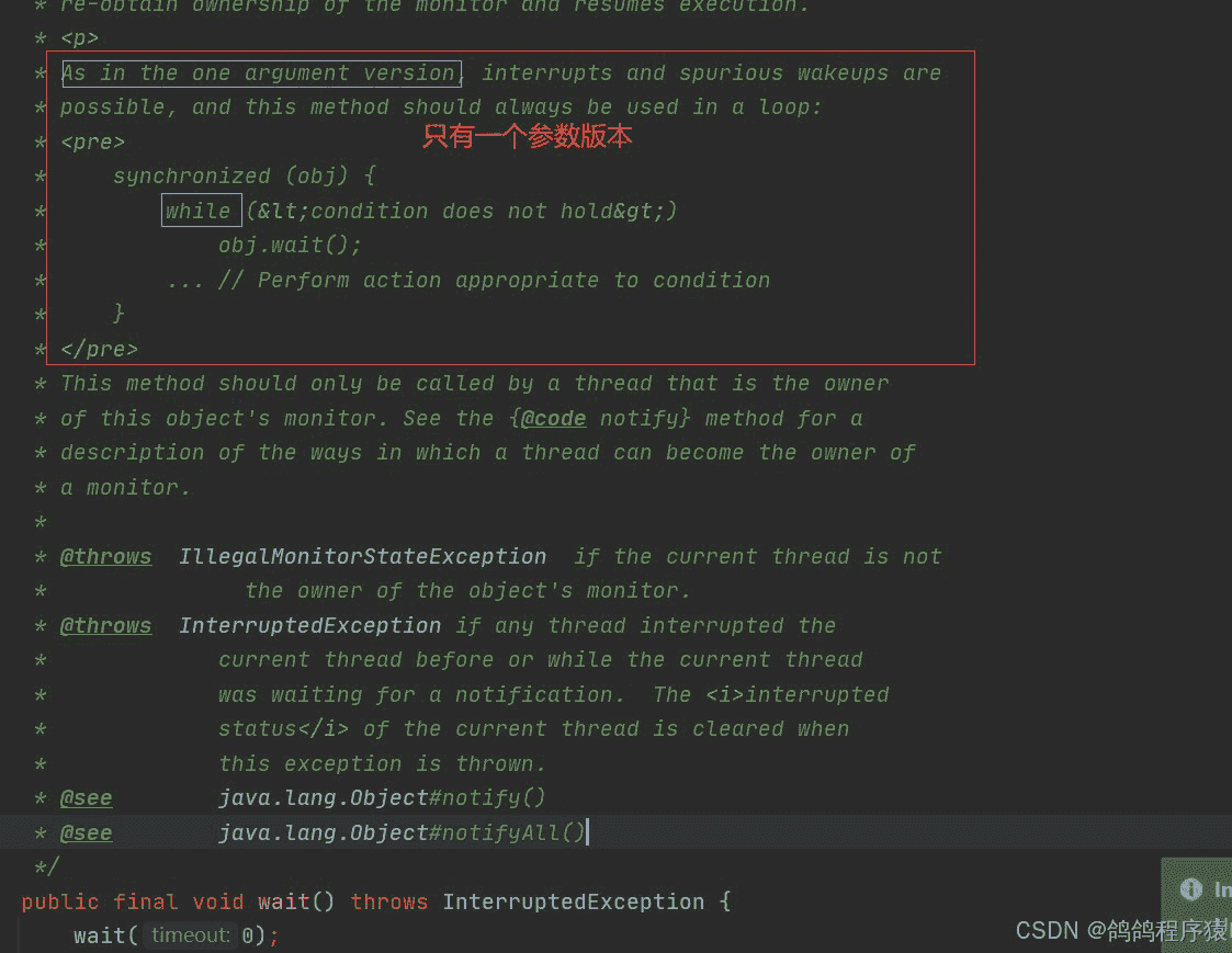 在put方法中我们需要在队列满的时候发生阻塞,使用wait来等待。而在Java官方文档给出了建议我们使用循环语句来使用wait。