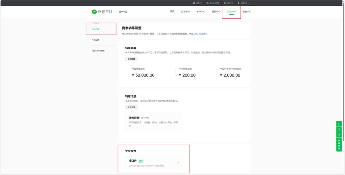 产品中心 -> 运营工具 -> 商家转账 -> 前往功能 ->安全能力-> 点击「接口IP」