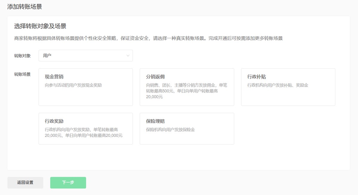 转账场景说白了就是你转账的用途。后面的接口调用全都需要跟你的场景挂钩,不同场景的参数都是不同的。