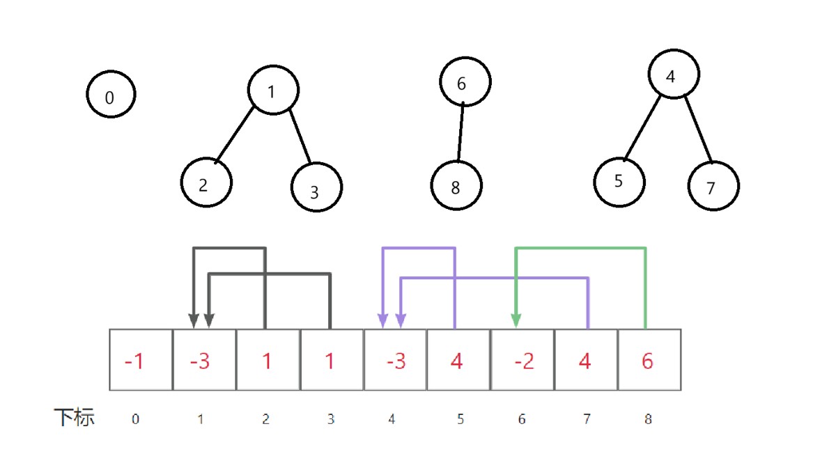 - 如果数组内容为负整数,代表这个下标是根,绝对值表示它这棵树的元素个数