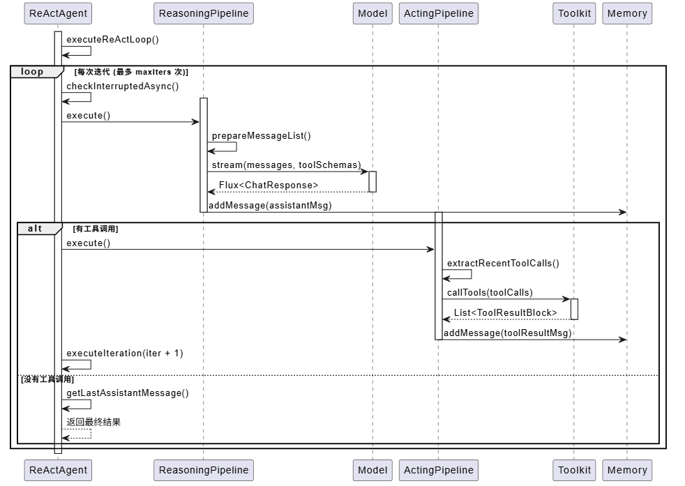 ReAct(Reasoning and Acting)是 AgentScope 的核心模式,它让智能体能够在推理和行动之间循环,直到完成任务或达到最大迭代次数。