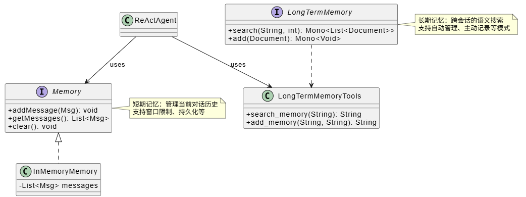短期记忆:InMemoryMemory 是最简单的实现,它将消息存储在内存中的 List<Msg> 中。每次调用智能体时,用户消息和智能体回复都会被添加到记忆中,形成完整的对话历史。