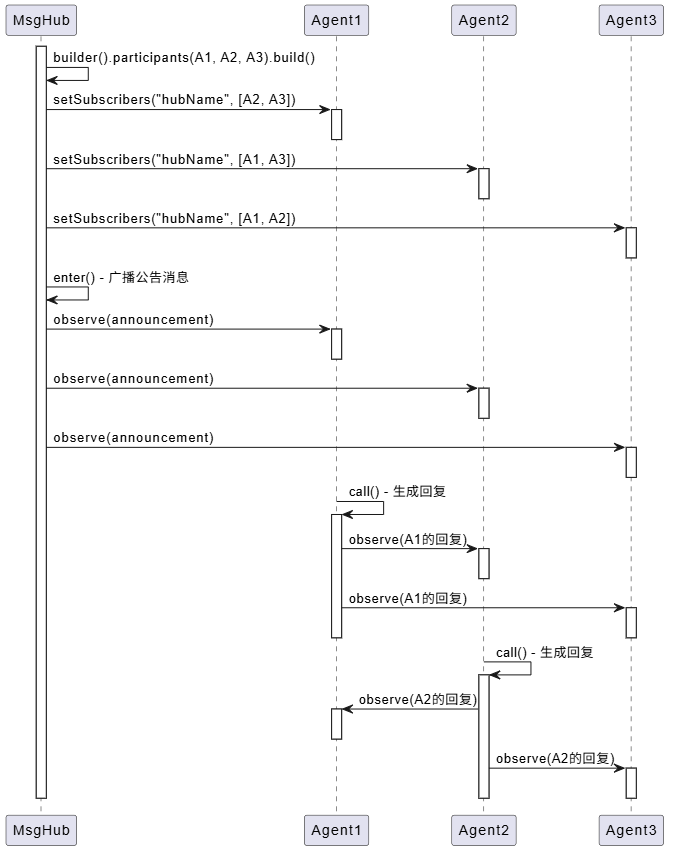 自动广播机制:当智能体加入 MsgHub 后,框架会自动设置订阅关系。每个智能体发送的消息会自动广播给其他参与者,无需手动调用 observe()。