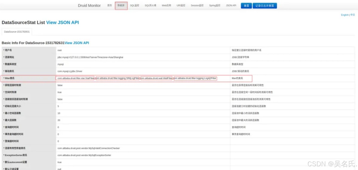 (2)数据源页面 是当前DataSource配置的基本信息,上述配置的Filter可以在里面找到,如果没有配置Filter(一些信息会无法统计,例如“SQL监控”,会无法获取JDBC相关的SQL执行信息)