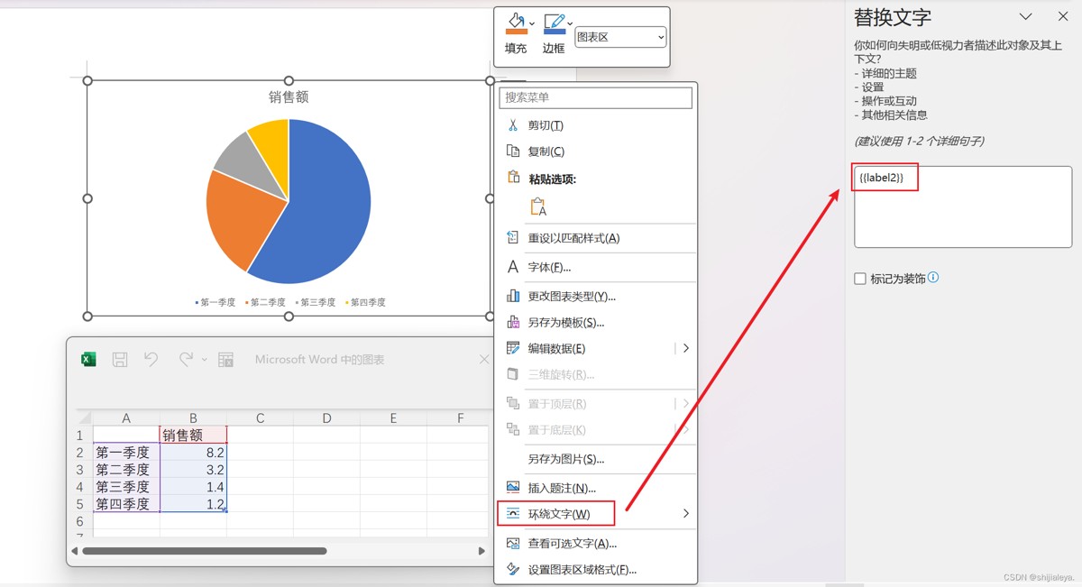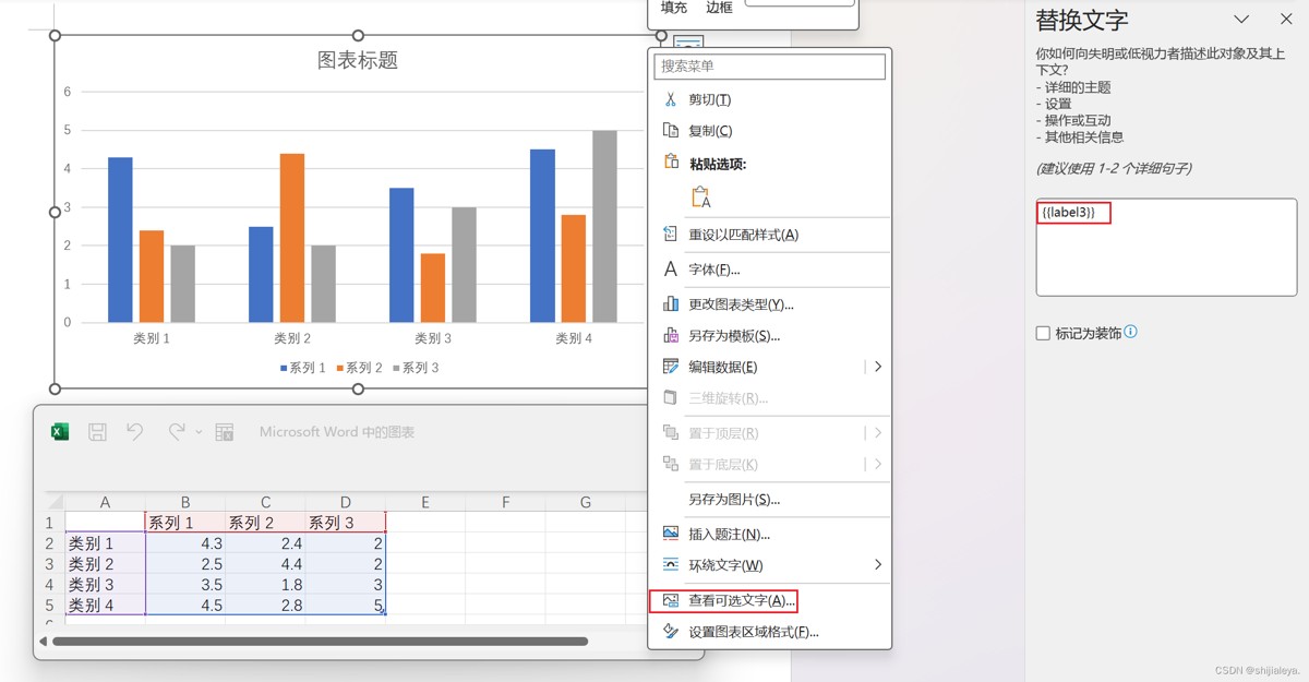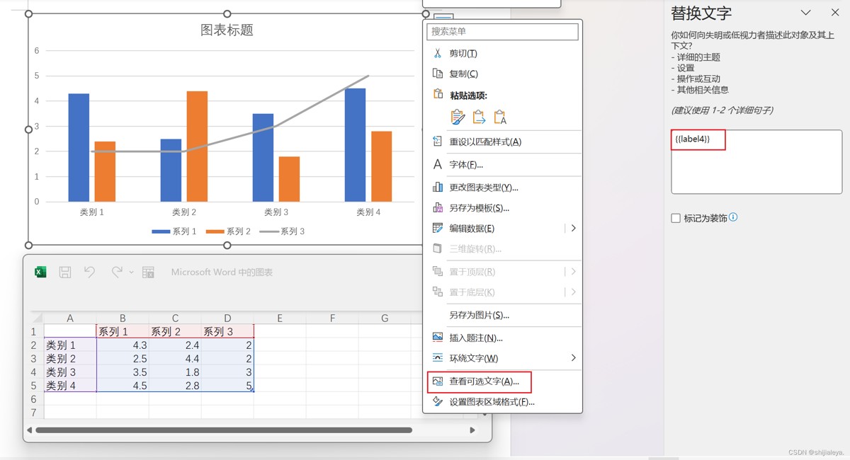 同引入标签插入图片一样,在插入图表的时候,需要在 docx 模板中创建一个单系列的图表,设置好样式,之后右键图表选择【查看可选文字】,在可选文字中通过 {{xxx}} 的方式填写属性名称。