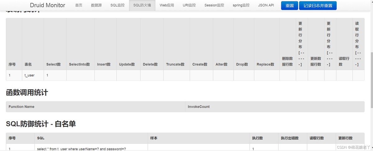 面板里是防御统计及sql的统计信息,这里用的是druid默认的一些过滤规则,并没有自定义复杂的防火墙规则,因此也不细说了。