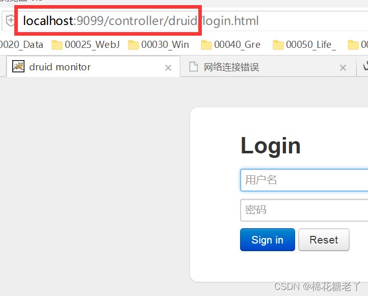 <!--连接池启用Web监控统计功能end-->重新构建工程并启动tomcat,启动项目http://ip:端口/项目名称/druid/即可进入到druid监控面板的登录页面,如下图。