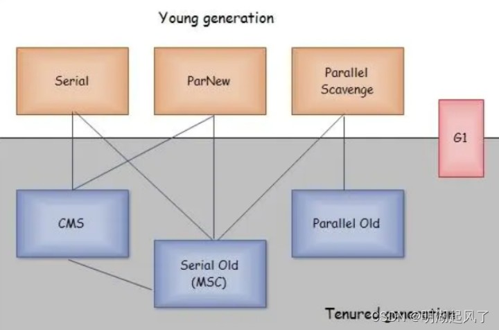 下图展示了7种作用于不同分代的收集器,其中用于回收新生代的收集器 包括Serial、PraNew、Parallel Scavenge,回收老年代的收集器包括Serial Old、Parallel Old、CMS,还有用于回收整个Java堆的G1收集器。不同收集器 之间的连线表示它们可以搭配使用。