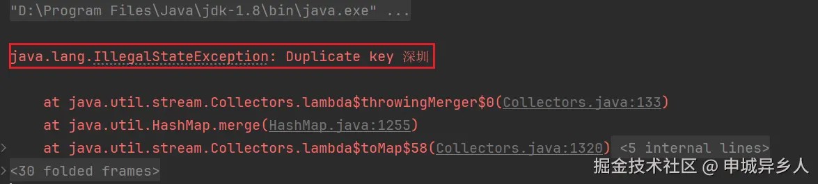 如果出现重复键,且没有提供mergeFunction参数,会抛出java.lang.IllegalStateException异常,如下示例: