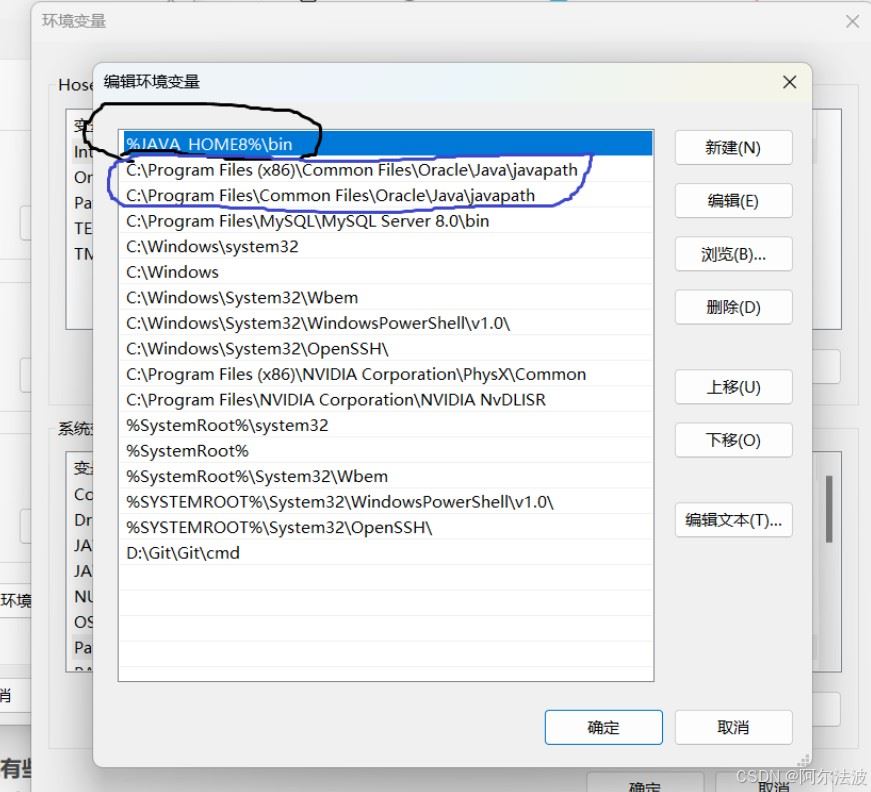 此外,还有一点需要注意,大家注意我蓝色线条圈出来的部分,那是JDK在安装的过程中默认生成的环境变量,如果我们先下载JDK8,它代表的就是JDK8,如果我们之后又下载了JDK11,那么它就会覆盖原来的JDK8,而且它又在我们自己自己创建的 "%JAVA_HOME8%\bin" 变量的上面,就会导致我们看似配置的是JDK8版本,但实际上系统在读取JDK变量的时候会先读取到上边的JDK11,而不会读取到我们下边自己配置的JDK8,因此,想要自己控制JDK版本,就需要我们将自己定义的 "%JAVA_HOME8%\bin" 上移到系统默认生成的变量的上面,将我们自己定义的JDK变量的优先级提高,小伙伴想省事直接放到最上面就可以了。