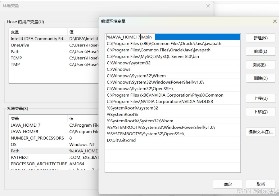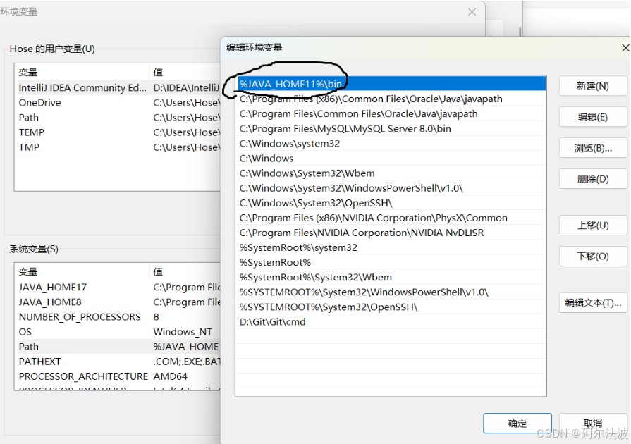 同理,和上面一样,先去path里面将变量从 "%JAVA_HOME11%\bin" 改为 "%JAVA_HOME17%\bin";