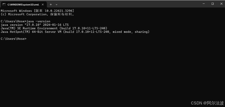 然后我们再次输入 java -version,就可以看到当前JDK版本为17,如下图所示