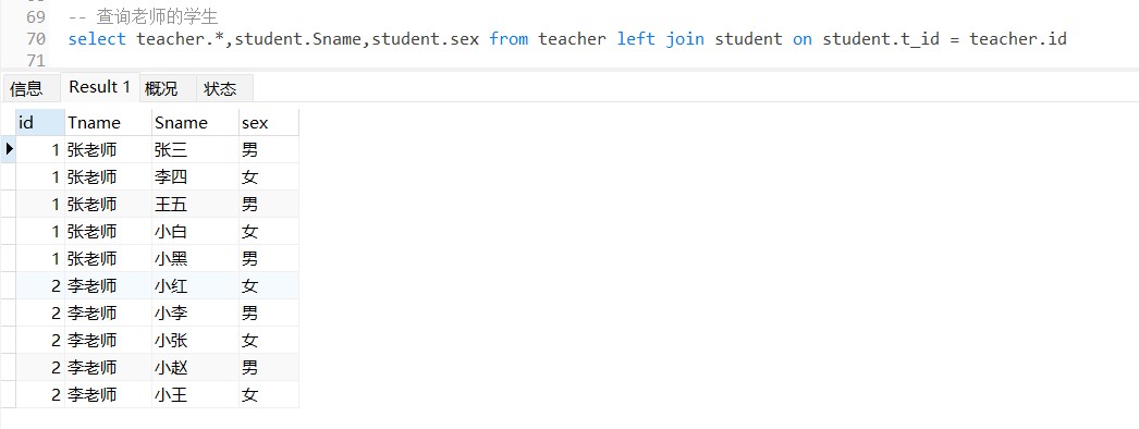 select teacher.*,student.Sname,student.sex from teacher left join student on student.t_id = teacher.id