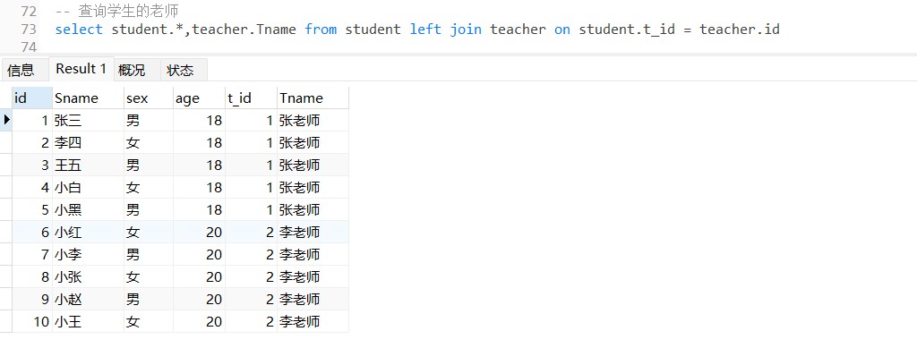 select student.*,teacher.Tname from student left join teacher on student.t_id = teacher.id