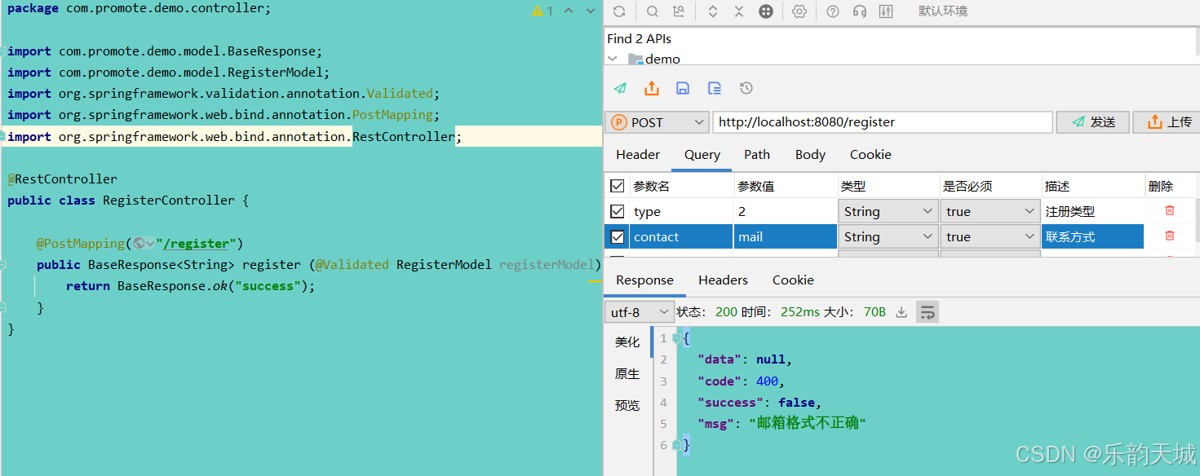 场景:假设我们有一个注册接口,有两个字段分别是注册类型(手机注册、邮箱注册)、联系方式,当用户以手机号注册时我们需要校验手机号是否合法,当用户以邮箱注册时我们需要校验邮箱是否合法。