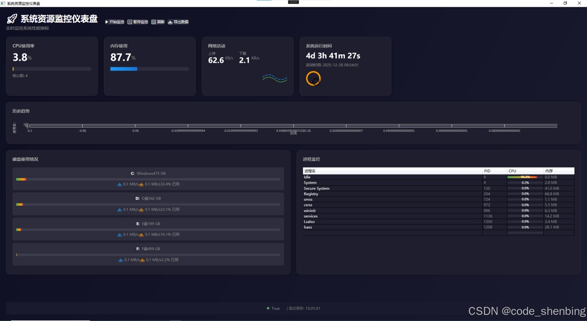 通过这个项目,您不仅学习了WPF的高级应用,还掌握了系统编程、性能监控和现代UI设计的最佳实践。您可以根据需要进一步扩展功能,如添加GPU监控、温度监控、日志记录等功能。
