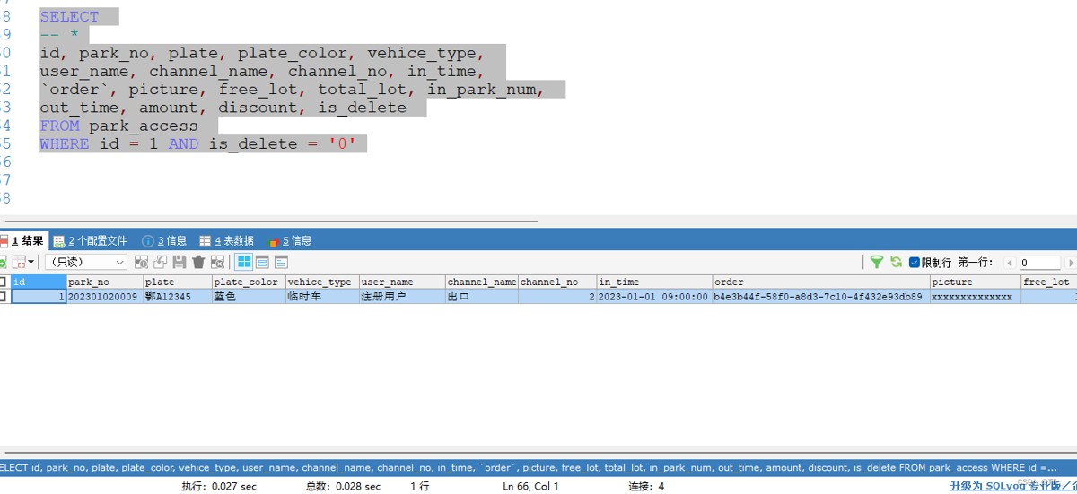 3.查询报错了,我就改变了如下的查询方式,用select * 查出来了记录,说明还是上面的sql有问题