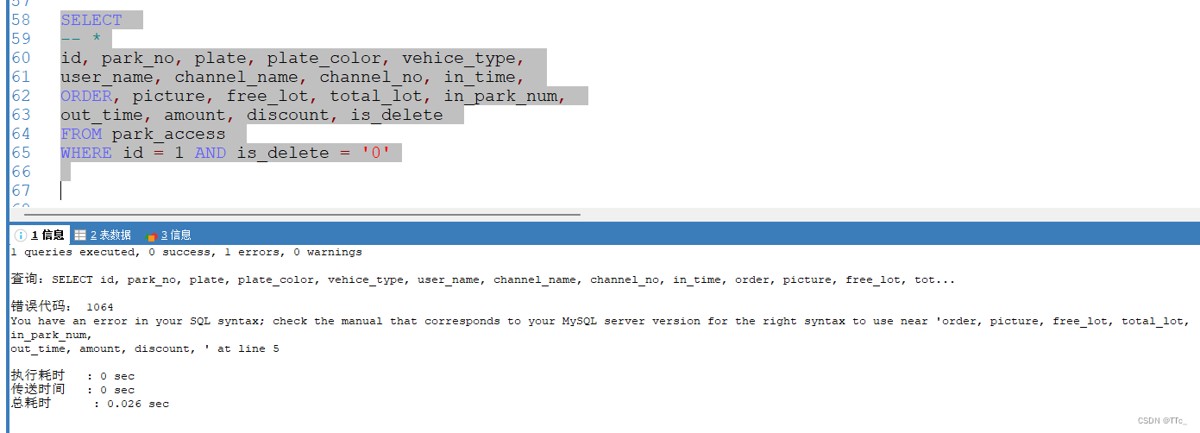 4.定位问题以后,知道是sql的问题,我就看字段发现有一个大写的字段好像是关键字,于是我就加上了反引号 `order`去查询就成功了。