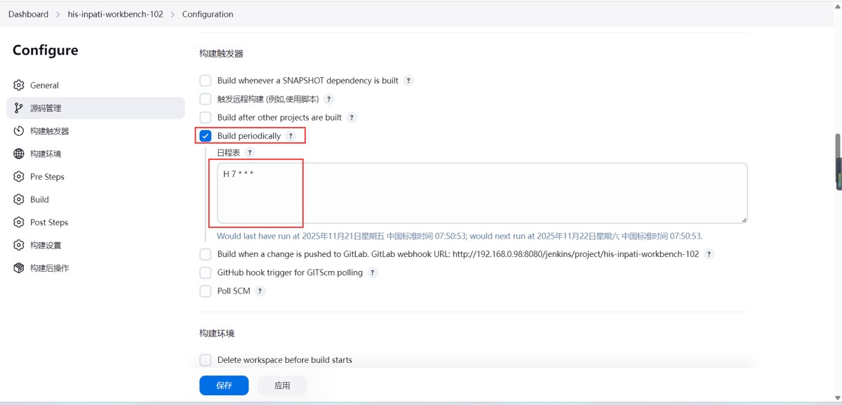 首页 > 软件编程 > java > Jenkins设置定时发布 Jenkins如何设置定时发布 2026-01-04 09:08:34 作者:TTc_ 文章讲述了如何在Jenkins中设置定时发布项目,首先找到要定时启动的项目,然后点击配置,选择构建时间,作者分享了这一过程,希望对大家有所帮助 Jenkins设置定时发布 1.找到要定时启动的项目 2.点击配置 3.选择构建时间 总结 以上为个人经验,希望能给大家一个参考,也希望大家多多支持脚本之家。 您可能感兴趣的文章:Jenkins定时构建语法规则及时间设置为Jenkins创建定时构建任务jenkins 实现shell脚本化定时执行任务的方法jenkins配置python脚本定时任务过程图解