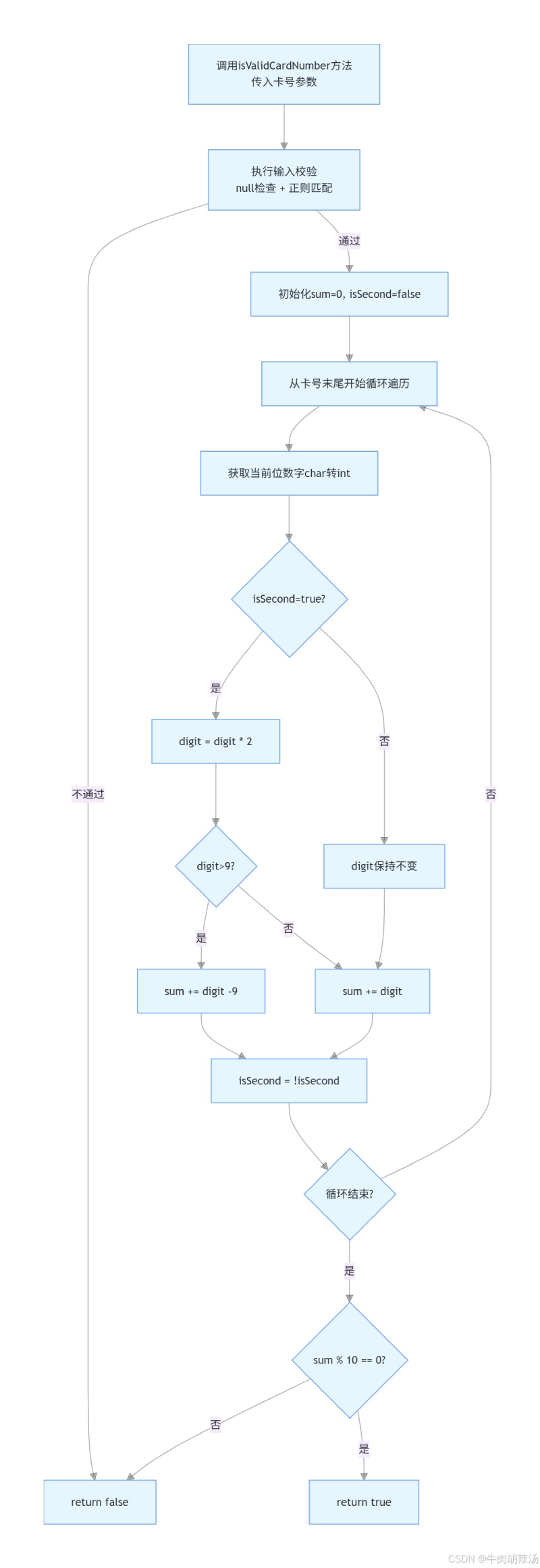 校验:如果总和能被10整除,则卡号通过Luhn算法校验,返回true;否则返回false。