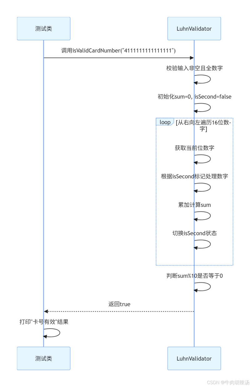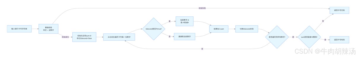 4.校验结果:return sum % 10 == 0:如果总和能被10整除,则卡号有效,否则无效。