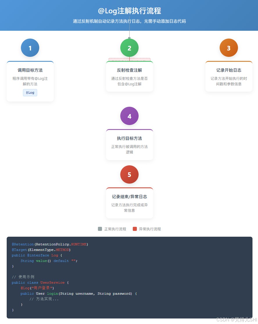 @Target(ElementType.METHOD):限制注解仅用于方法(符合日志记录的场景);@Retention(RetentionPolicy.RUNTIME):必须保留到运行时,否则反射无法获取。
