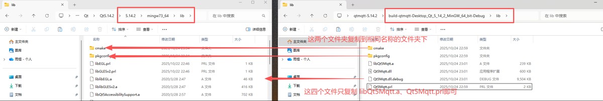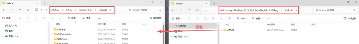 编译完成会生成一个build-qtmqtt-Desktop_Qt_5_14_2_MinGW_64_bit-Debug的文件夹,主要复制该文件夹下bin、include、lib、mkspecs文件夹的文件