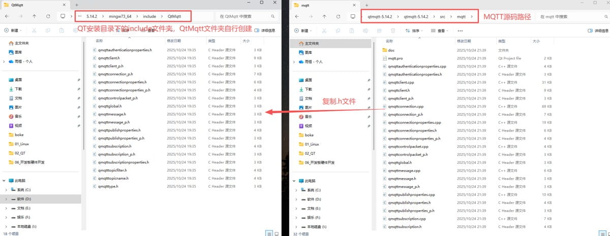 1.解压源码,然把MQTT源码\src\mqtt文件夹下的.h文件打包到一个QtMqtt的文件下、并把文件夹移动到QT安装目录的\mingw73_64\include文件夹里。
