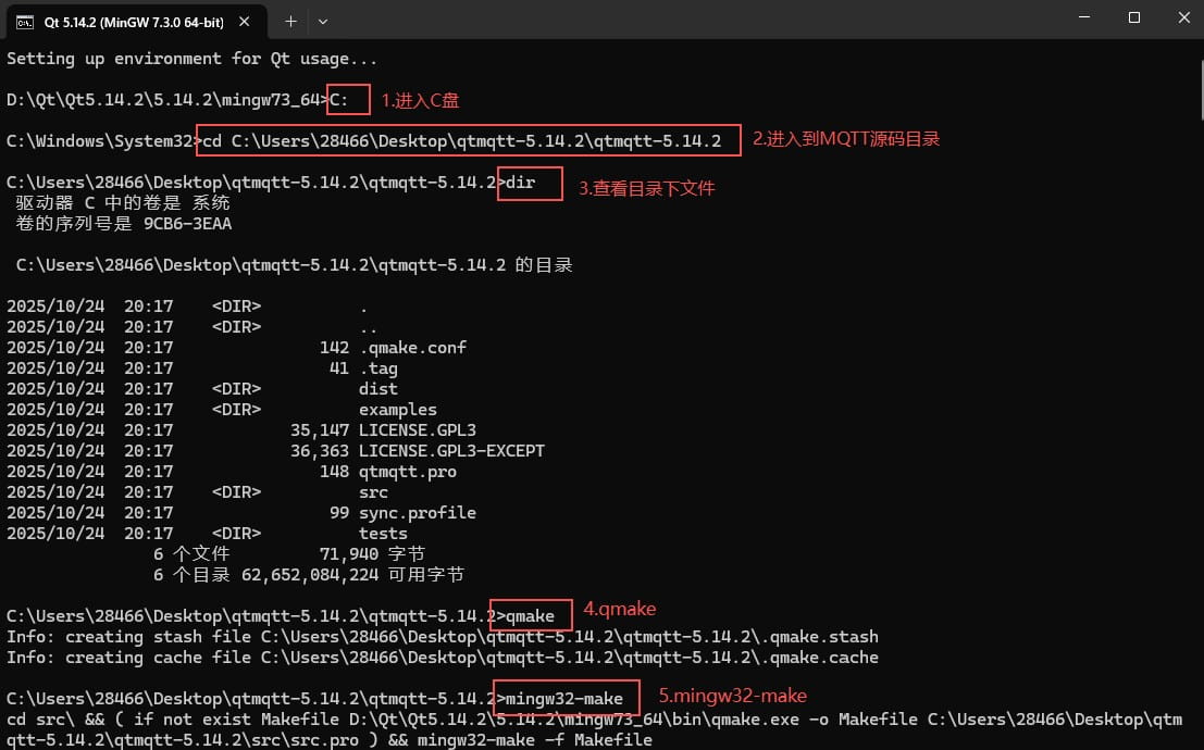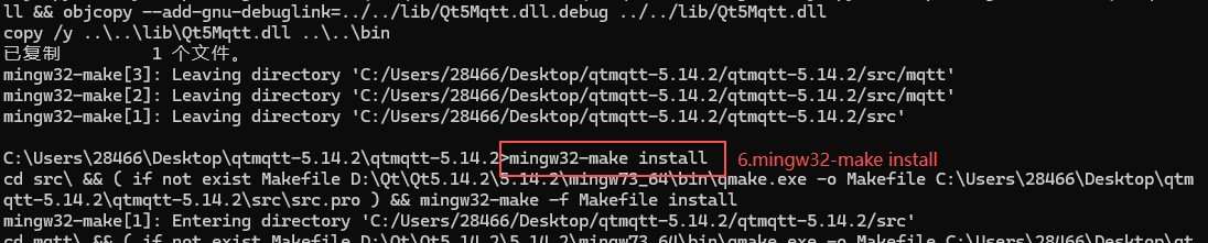 3.进入到MQTT源码的目录下,然后依次执行qmake、mingw32-make、mingw32-make install 指令