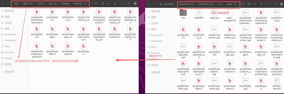 1.解压源码,然把MQTT源码\src\mqtt文件夹下的.h文件打包到一个QtMqtt的文件下、并把文件夹移动到QT安装目录的\gcc_64\include文件夹.