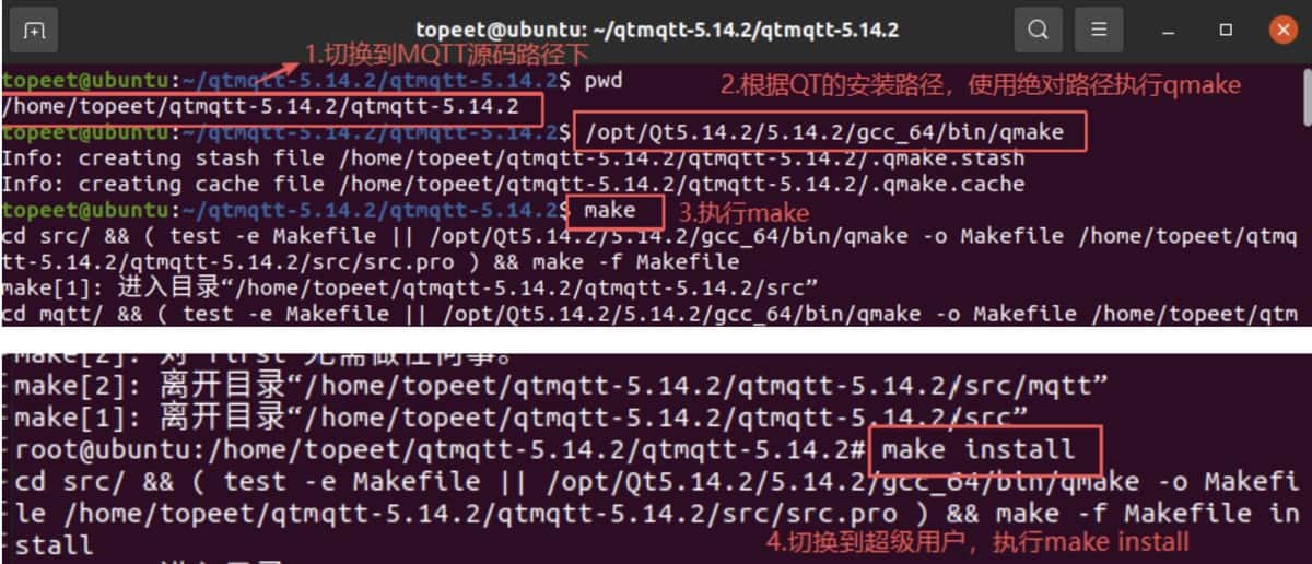 2.进入到MQTT源码的目录下,然后依次执行qmake、make、make install 指令
