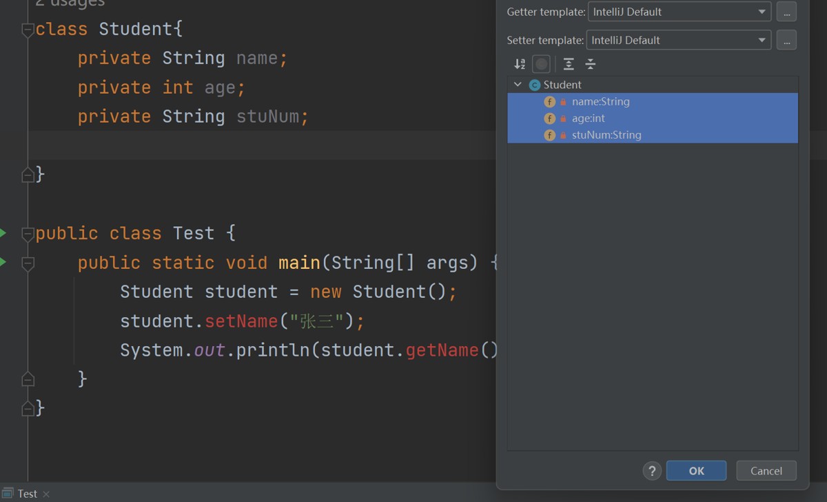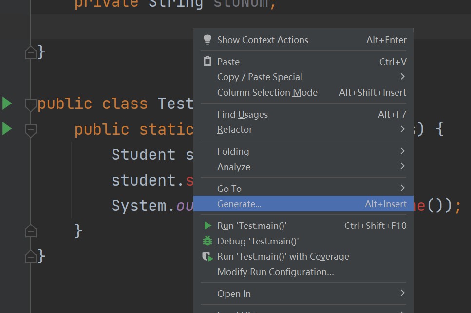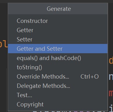 但是每个成员变量都要写过于麻烦,因此idea提供一种快捷方法,可以直接生成这两个方法:
