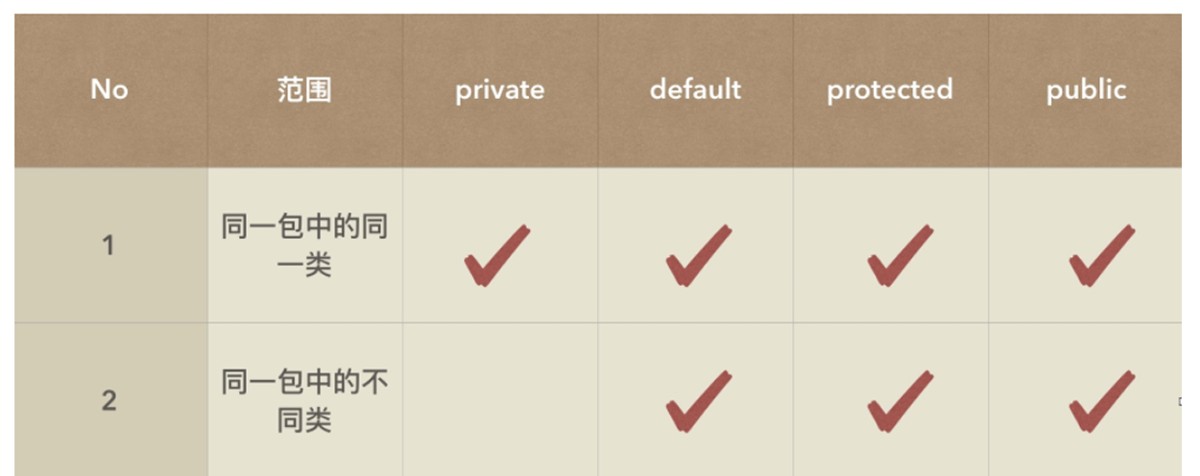 访问权限范围有四个:private ,默认的, protected , public 。只有三个访问修饰符它们的访问权限也是不一样的。如图所示:
