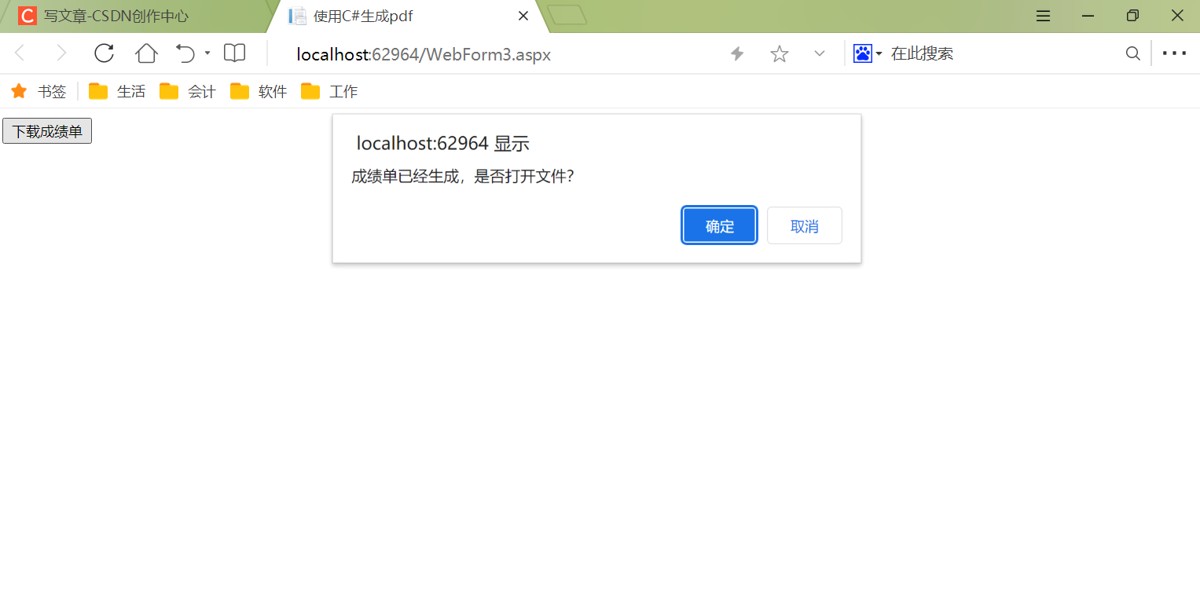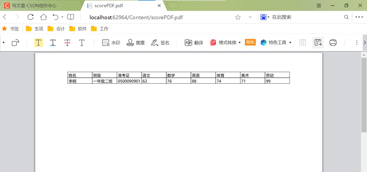 2.后端C#代码的编写:引入iTextSharp库,使用.ashx一般处理程序响应前端的请求,在指定的物理路径中生成成绩单pdf文件,并写入信息;