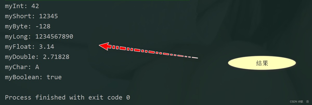 }myInt: 42 myShort: 12345 myByte: -128 myLong: 1234567890 myFloat: 3.14 myDouble: 2.71828 myChar: A myBoolean: true