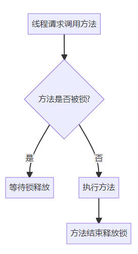 synchronized,JVM自动加锁,无需手动。 - 进入方法即持有对象锁,其他线程需等待。