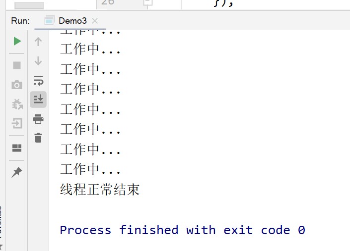 我们让线程工作三秒钟,此时while循环每次循环开始前检查中断状态,当执行执行中断指令后,线程结束循环,但线程不会强制停止线程的执行,继续把线程正常结束语句继续打印完后再结束。