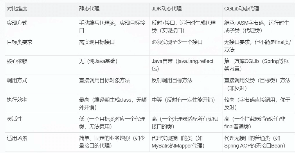 - 静态代理适合简单、固定的业务场景,执行效率高但灵活性差;JDK 动态代理依赖接口和反射,适配多数有接口的代理场景;CGLib 通过继承实现,适合无接口的普通类代理,性能优于 JDK 动态代理。