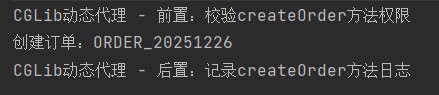 OrderService target = new OrderService();:创建目标对象(普通类,无接口);CglibDynamicProxyInterceptor interceptor = new CglibDynamicProxyInterceptor(target);:创建拦截器,传入目标对象;OrderService proxy = (OrderService) interceptor.getProxyInstance();:生成代理对象(目标类的子类实例),因此能强转为OrderService类型;proxy.createOrder("ORDER_20251226");:调用代理对象方法,触发intercept方法,执行增强逻辑和目标方法调用。