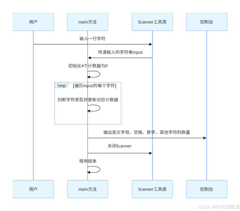 }使用 for 循环遍历输入字符串的每个字符。根据字符的类型(字母、数字、空格或其他),增加相应的计数器。