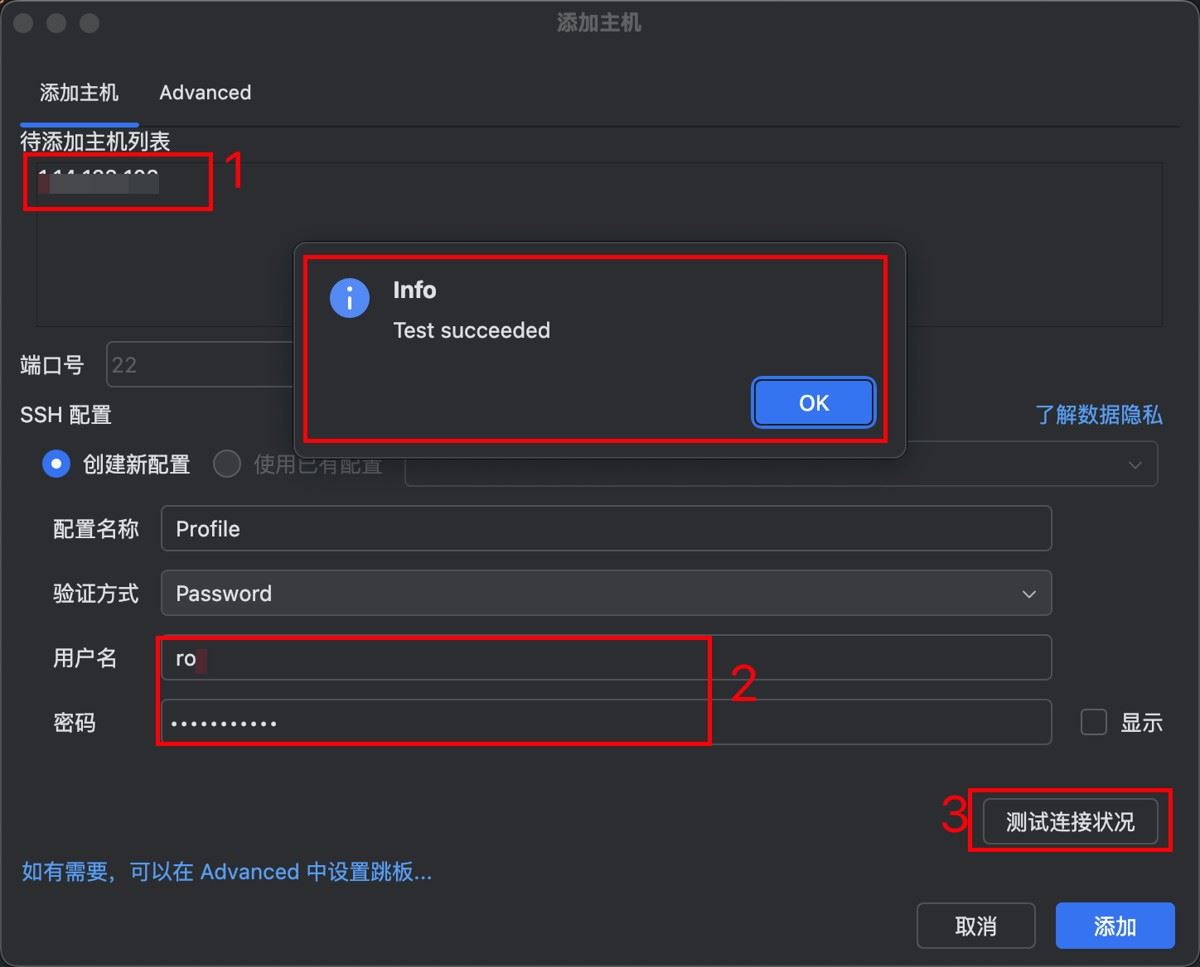 2. 主机 IP、用户名、密码 点击测试链接