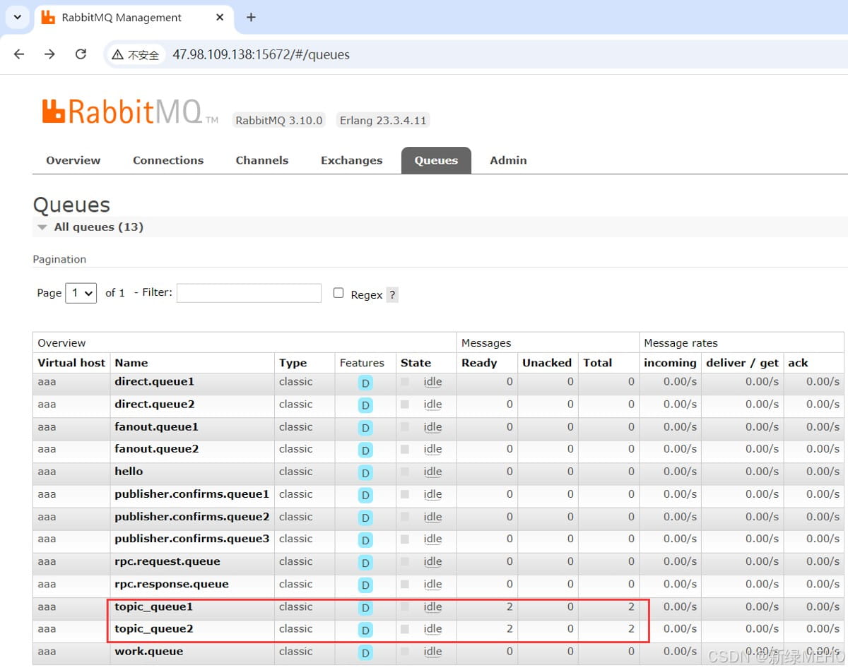 观察管理界面可以看到两个队列都各自收到了2条消息,与预期符合。