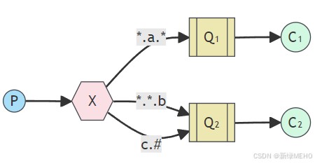 Topics和Routing的基本原理相同,即:⽣产者将消息发给交换机,交换机根据RoutingKey将消息转发给与RoutingKey匹配的队列. 类似于正则表达式的⽅式来定义Routingkey的模式.