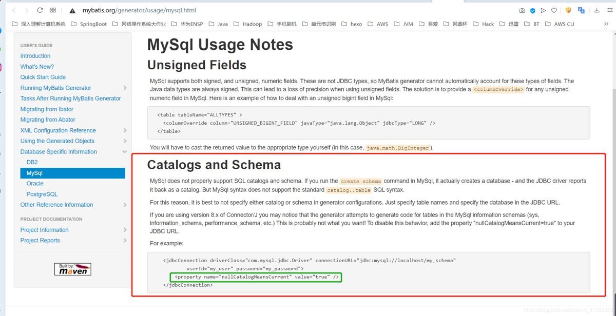 翻译如下:Mysql 无法正常支持 SQL catalogs 和 schema。因此,最好不要在 generator 配置文件中指定 catalog 以及schema,仅需指定数据表的名字并在 JDBC URL 中指定数据库即可。