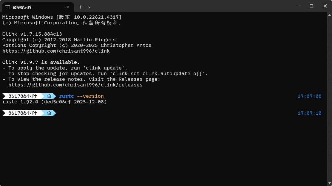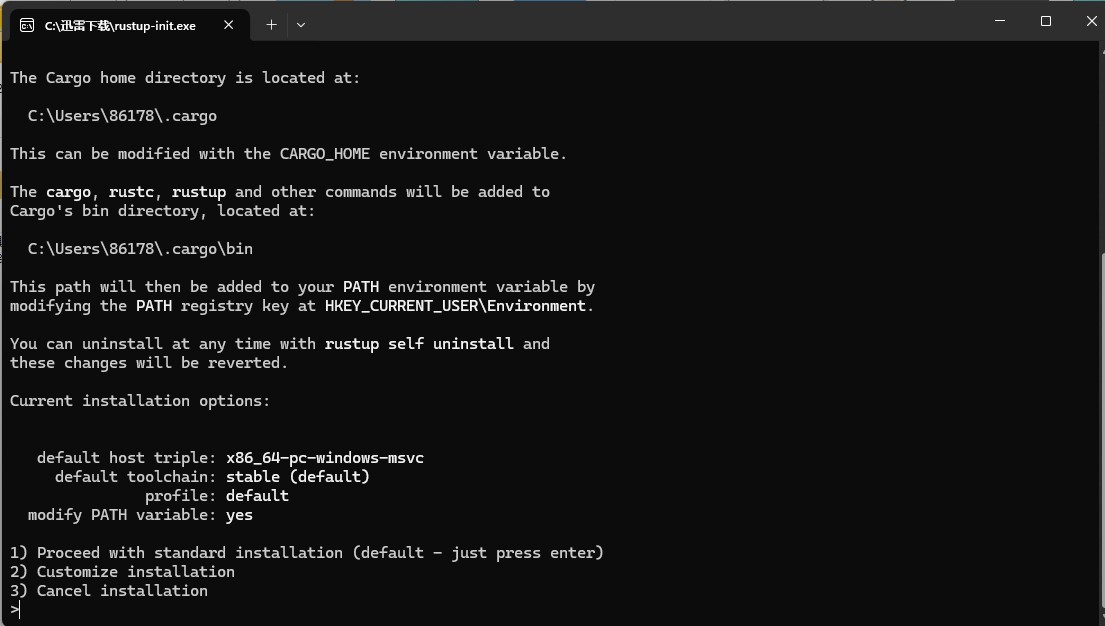 安装完成之后打开cmd控制台,输入下面的命令查看rust编译器版本