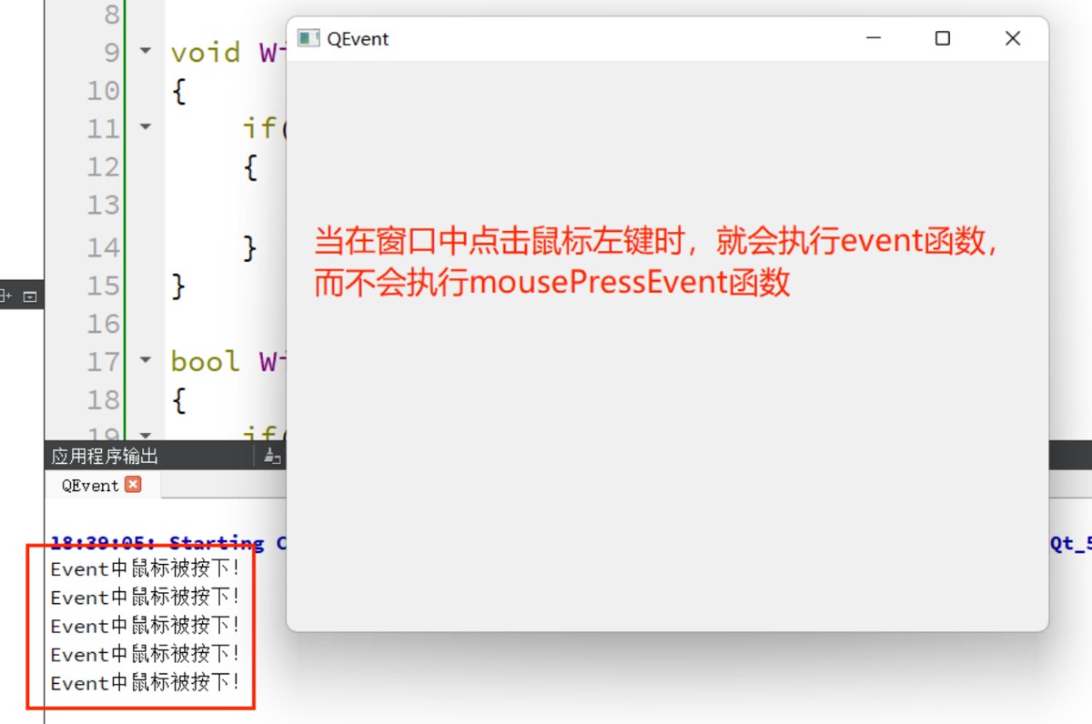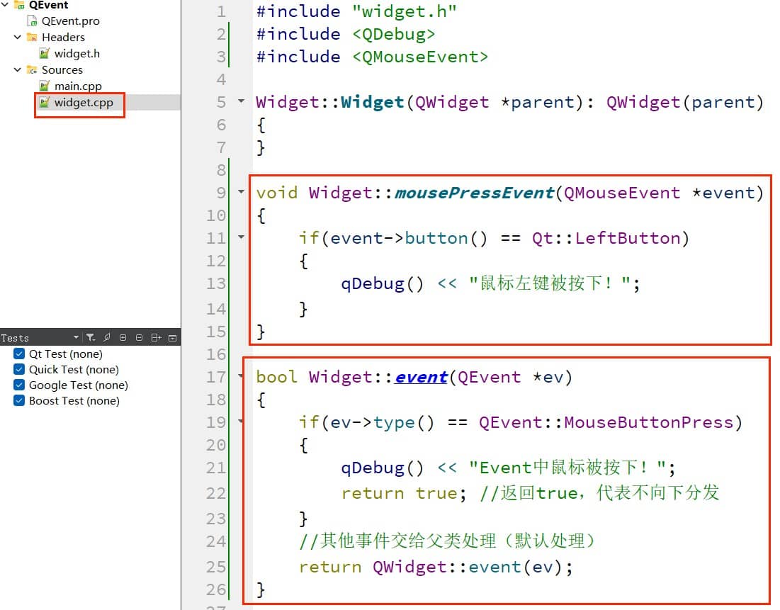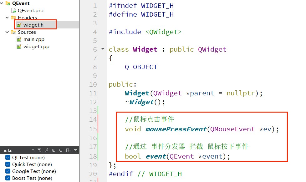 1、在 “widget.h” 头文件中声明 鼠标点击事件 和 事件分发器 ;如下图示: